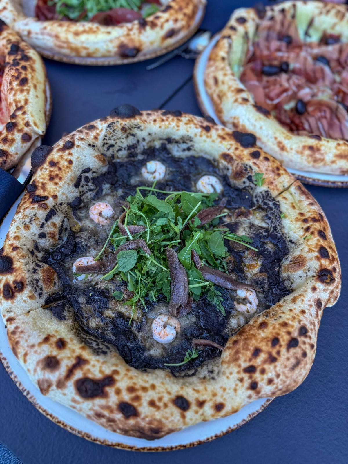 The other two pizzas were somewhat less successful. Pescatore (€14.90), with a black olive pesto base, shrimp, arugula, and anchovies, is imaginative and visually interesting. However, the black olive pesto is on the upper limit of saltiness. Although olives themselves are salty, the pesto could have been toned down as its intensity overpowers the whole pizza, while the other ingredients work well together.