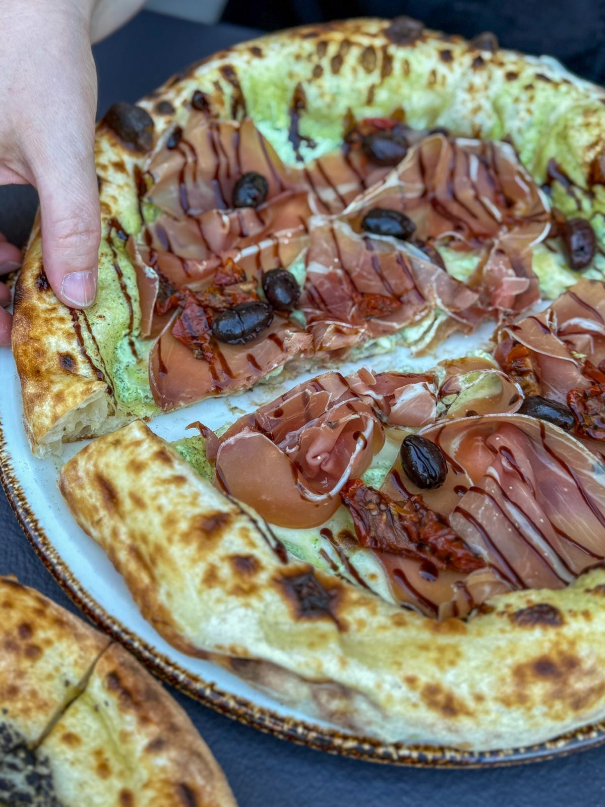 Benvenuti (€12.90) is also successful. It‘s a successful white prosciutto-themed pizza, consisting of a ricotta and garlic base, prosciutto, sun-dried tomatoes, aceto, and olives. Although we have minor criticisms of the prosciutto, which should be tastier, the base is very light and fine. Fantastic Kalamata olives and fine sun-dried tomatoes round off the impression of a very good pizza.